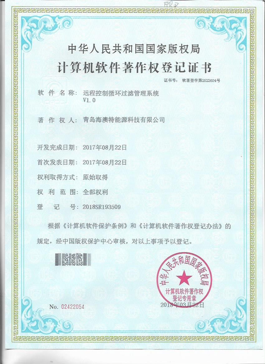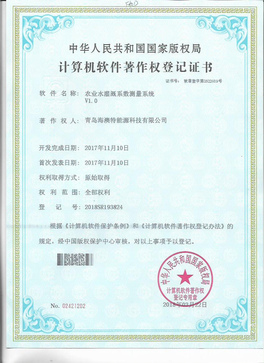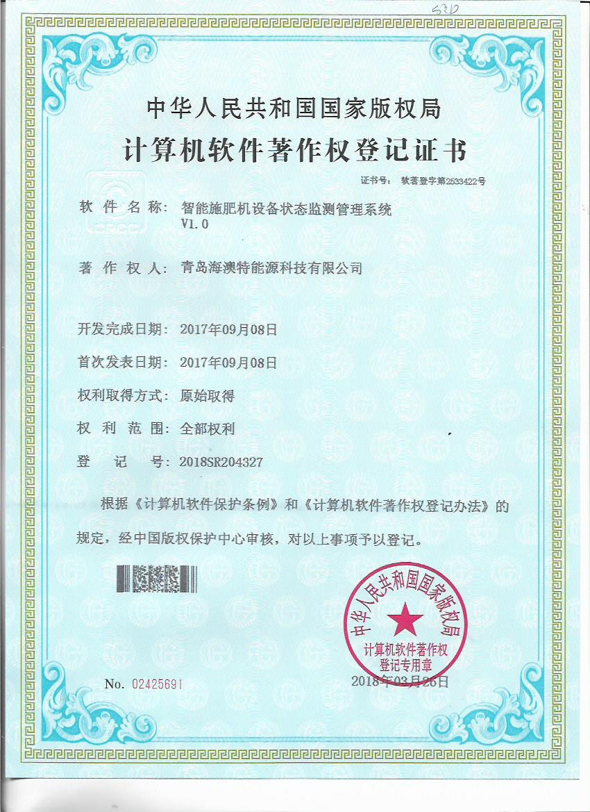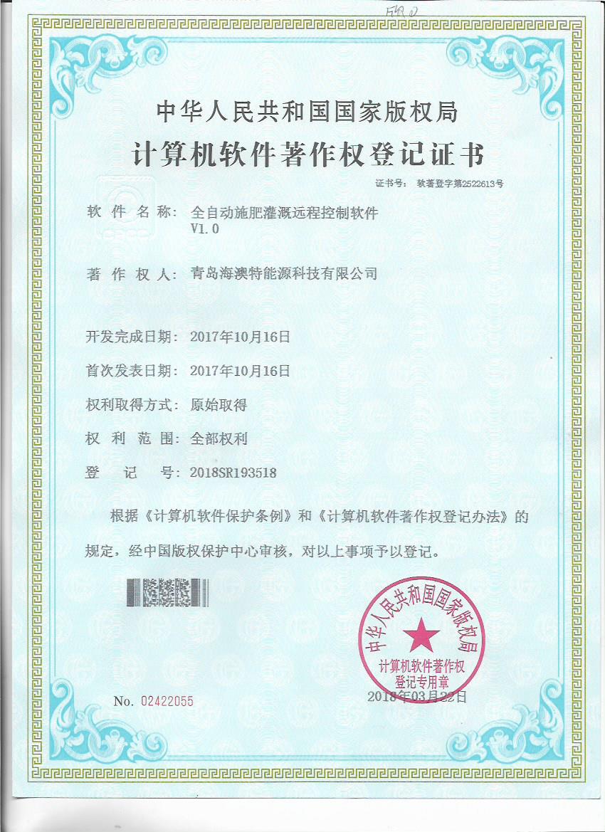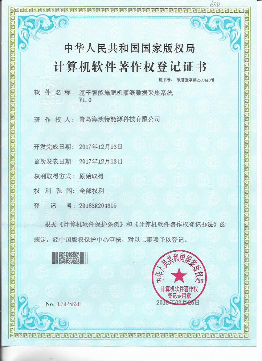 日前,青岛海澳特能源科技有限公司获得“全自动施肥灌溉远程控制软件V1.0”等五个计算机软件著作权登记书。青岛海澳特能源科技有限公司肩负北京新型智慧农业研究院水肥一体化研究中心有关软件开发、智能施肥机设计等技术工作,拥有一支实力较强的研发团队,该软件著作权的获得,既是对研发成果的认可,也为公司技术发展提供了保障。